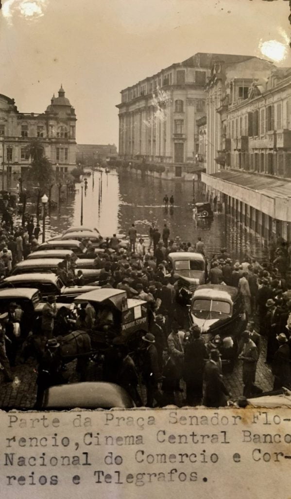 Porto Alegre – Enchente – Praça Senador Florêncio, Cinema Central, Correios, Banco Nacional de Comércio – 1941 05/05/2024 Por André Prati Fonte: não identificada.
