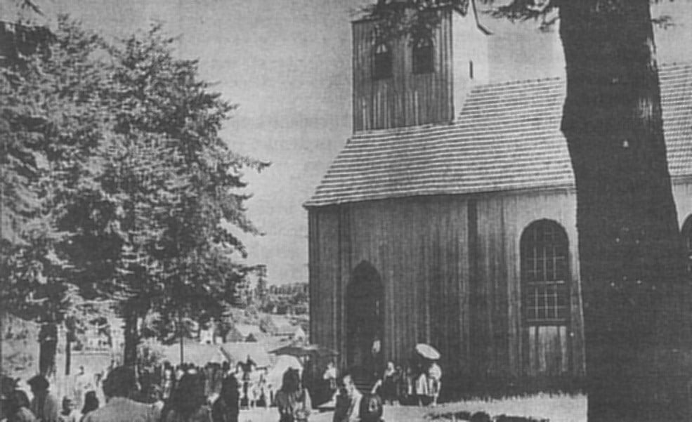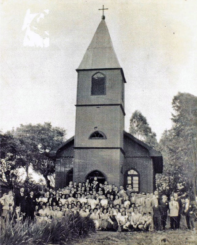 Três Cachoeiras – Distrito de Torres – Casa à esquerda do Sr Luizinho Maggi à direita a antiga capela onde a BR101 seria aberta – década 1920