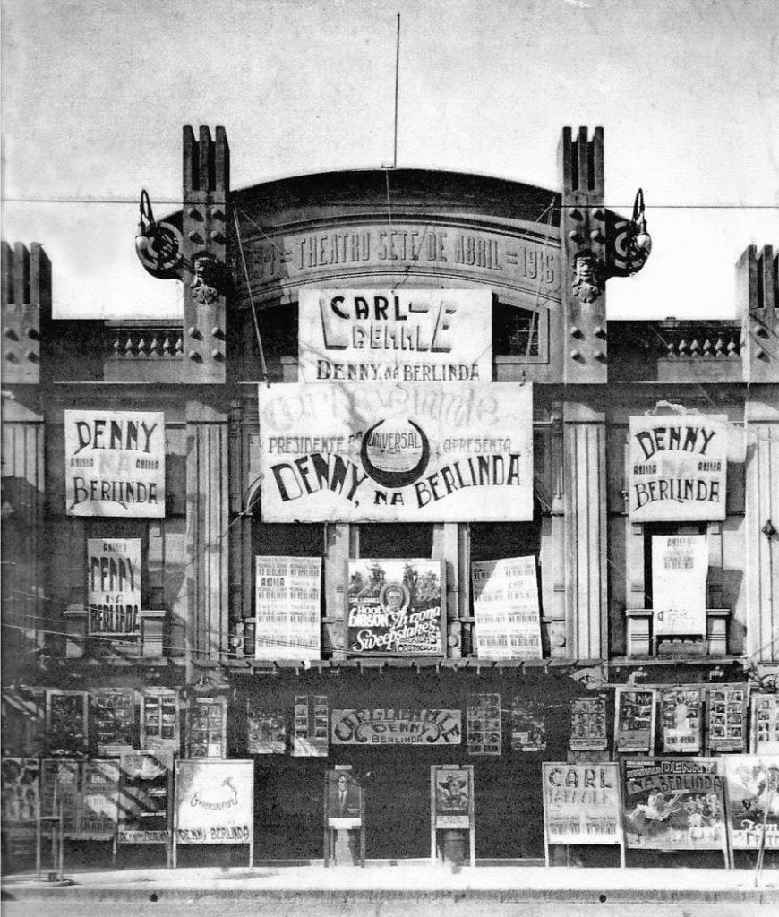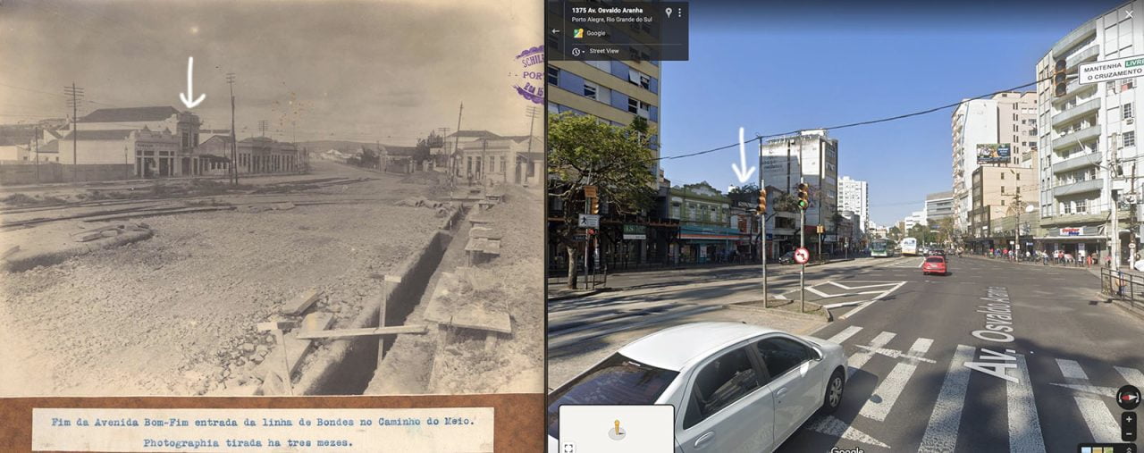 Porto Alegre – Av Oswaldo Aranha com Av Venâncio Aires à direita, ao fundo Av Protásio Alves, indicação de prédio ainda existente. Ano de 1920 e 2020
